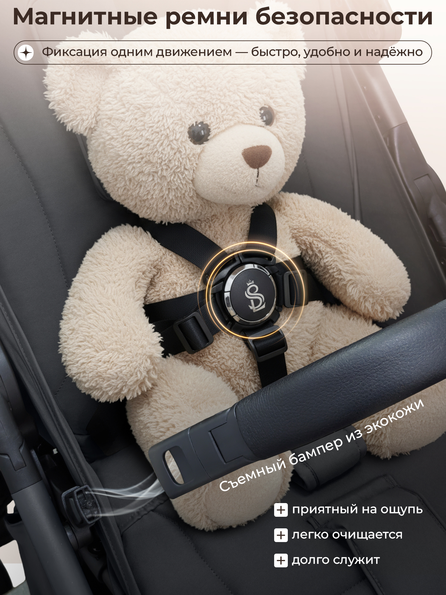 Широкое и комфортное сиденье обеспечит вашему ребенку удобство даже в комбинезоне. Магнитные ремни безопасности добавляют удобства родителям. Большое спальное место позволит малышу чувствовать себя уютно в поездке.