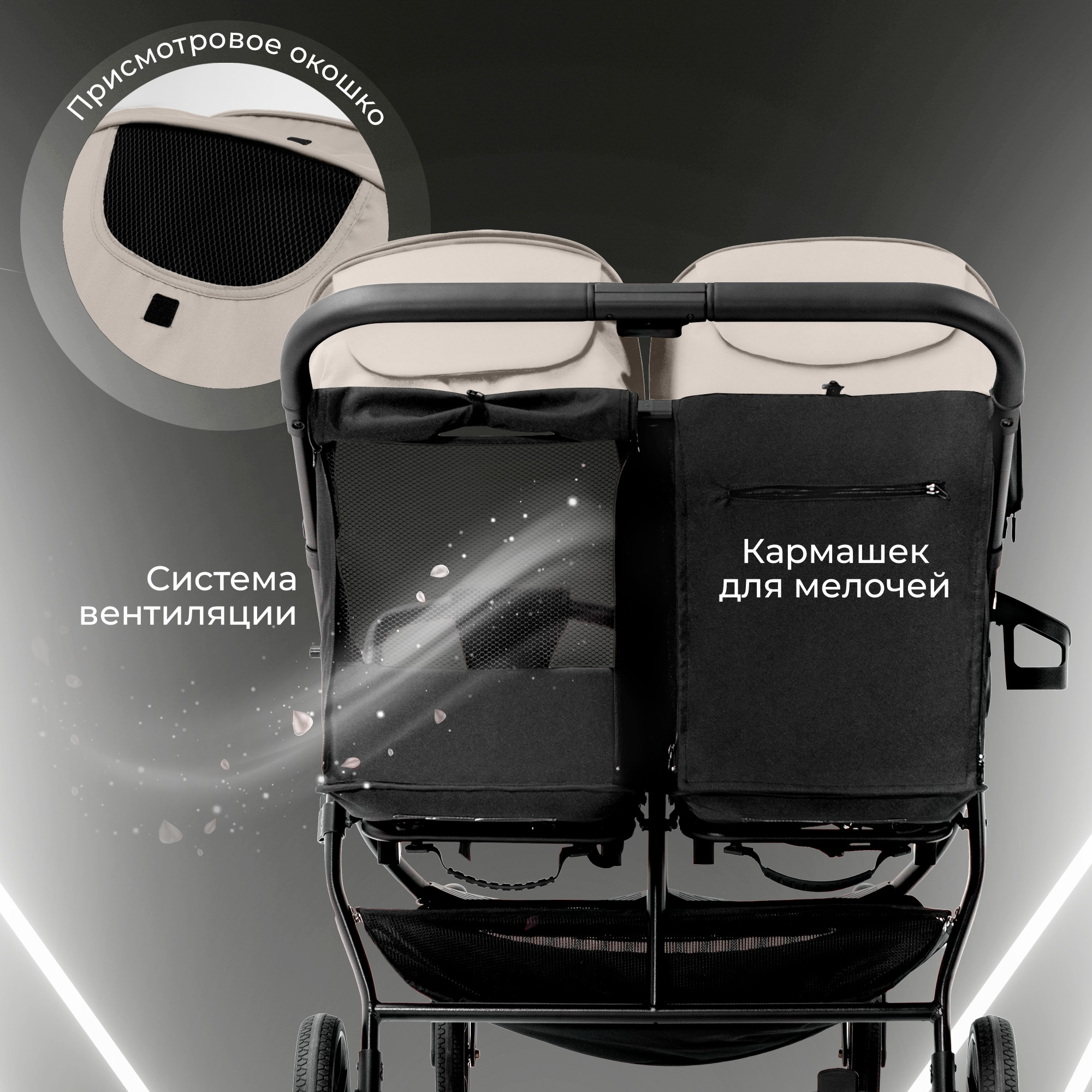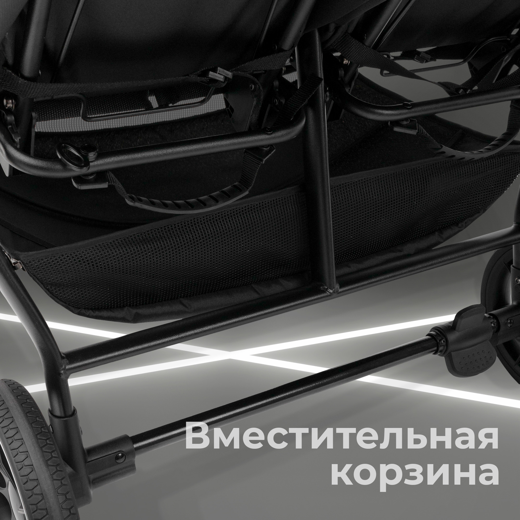 - Рама коляски оснащена двумя сиденьями с индивидуальными системами регулировки, что обеспечивает максимальный комфорт во время поездок с двумя малышами.