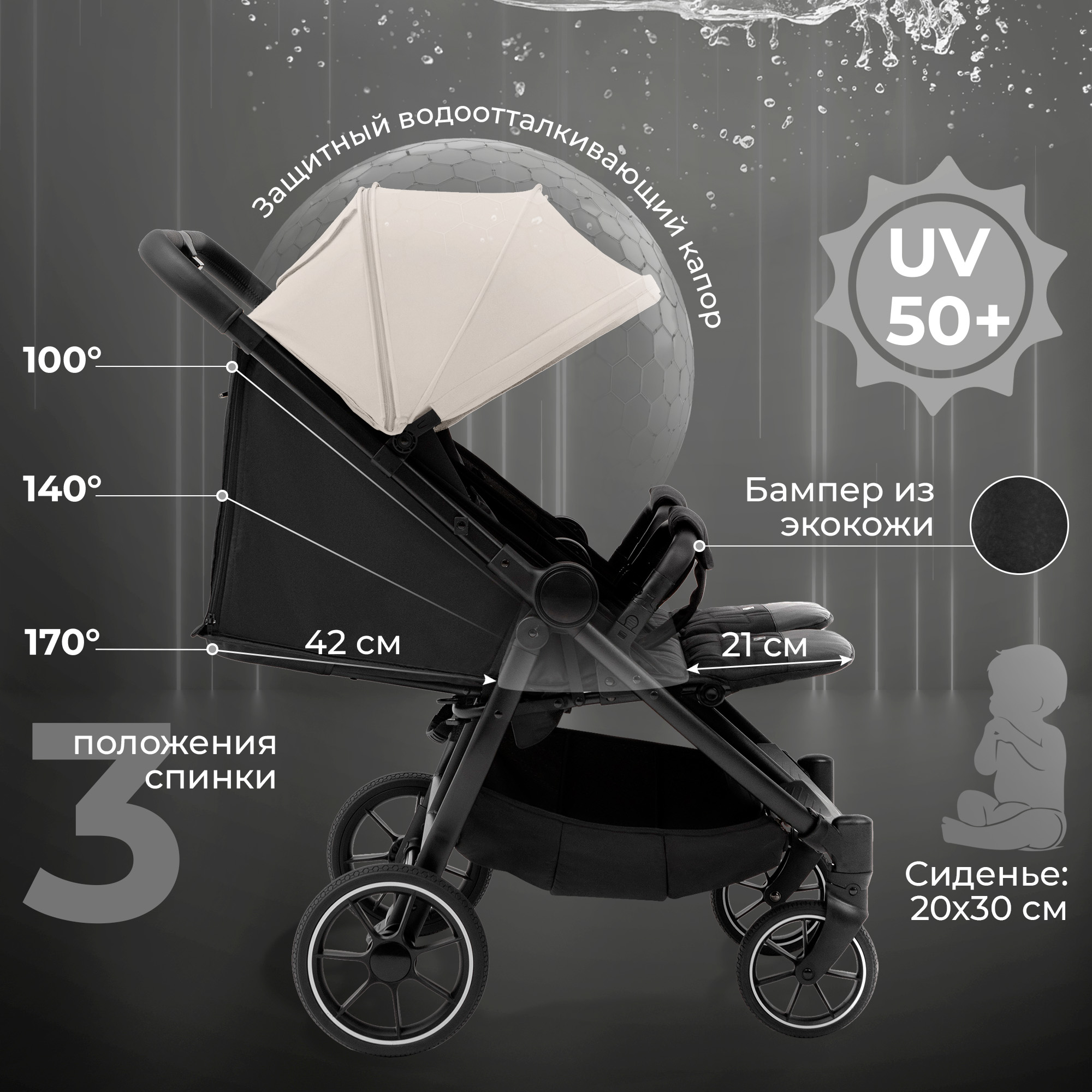 - Утепленные накидки для ножек и глубокий капюшон гарантируют комфортные прогулки при любой погоде.
