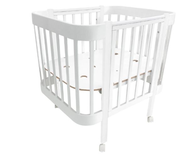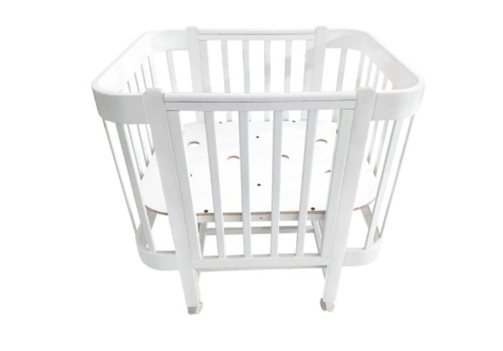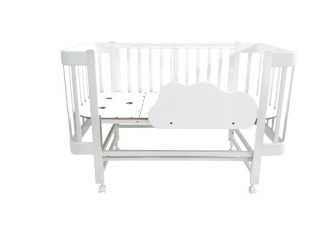 - Трансформация 4-в-1: колыбель 90×70 см, большая кровать 140×70 см, приставная кровать 90х70 и диванчик 140×70.