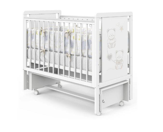 Кроватка Indigo "Happy Friends" — это современная и функциональная модель, разработанная специально для магазинов, которые ценят в своём ассортименте качество, универсальность и привлекательный внешний вид. Конструкция выполнена из массива берёзы и ЛДСП, оформлена в популярном цвете "белая аляска" с нежным рисунком мишек на изголовье — акцент, который оценят молодые родители. Маятниковый механизм обеспечивает мягкое укачивание ребёнка, а комплект поворотных колёс делает кроватку мобильной и удобной для перемещения по комнате.