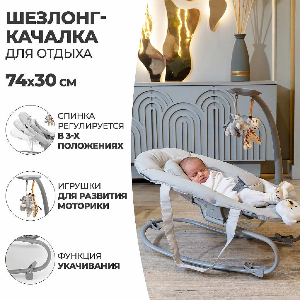 Пока малыш еще совсем маленький используйте шезлонг с регулируемой по наклону спинкой, обеспечивая комфортное положение для сна или игры.
