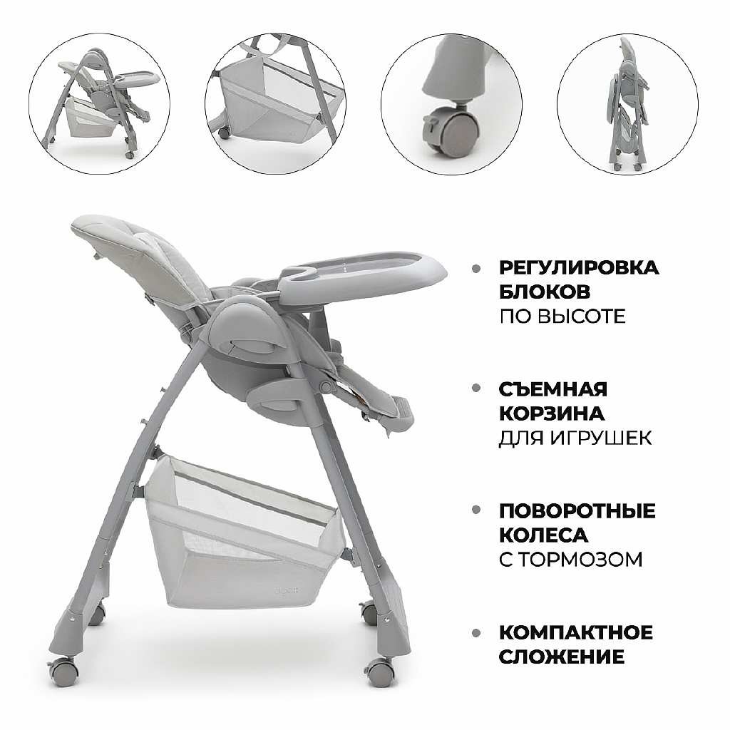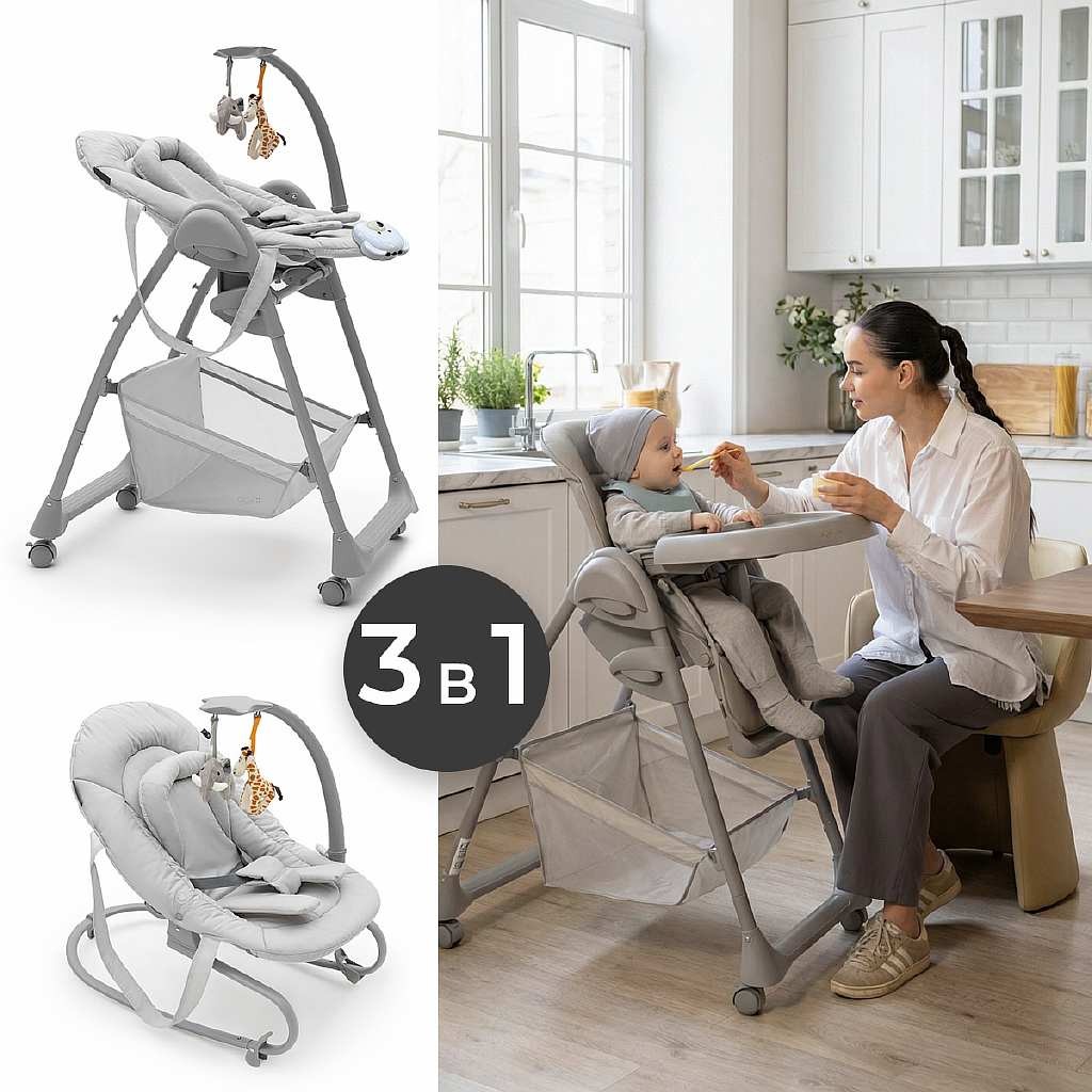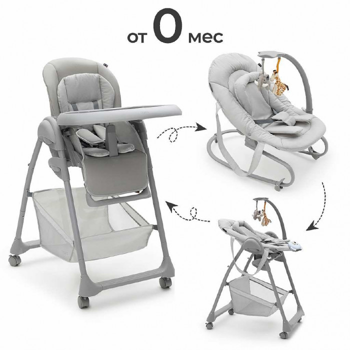 Когда малыш научится сидеть самостоятельно, можно пересаживать его в стульчик. Высота стульчика легко регулируется, что позволяет малышу сидеть с Вами за обеденным столом. Для безопасности используются 5-точечные ремни.