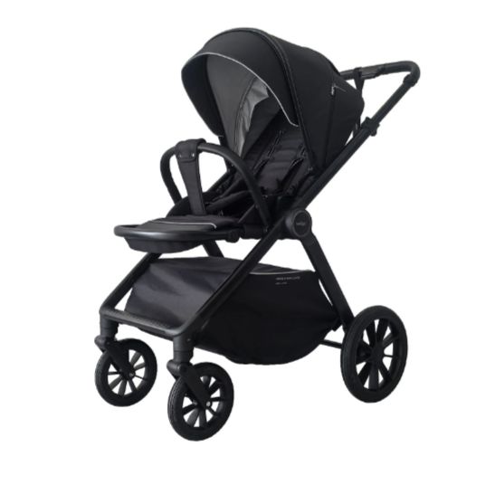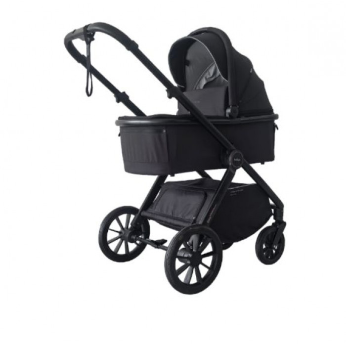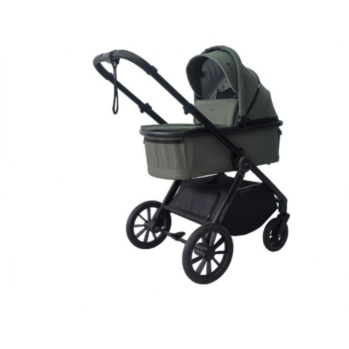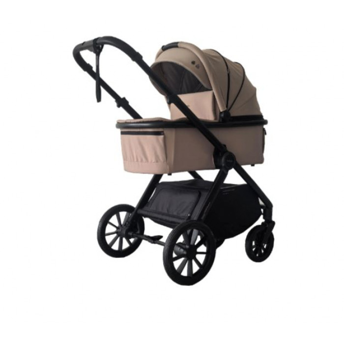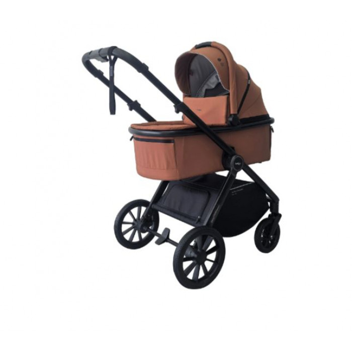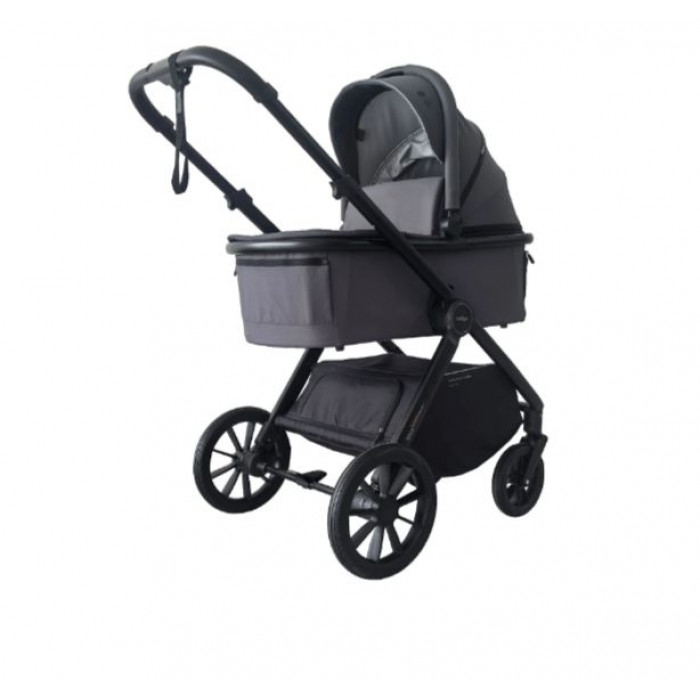Коляска оснащена полиуретановыми колесами диаметром 20 и 29 см, амортизацией передних и задних колес, центральным тормозом и поворотными передними колесами с фиксацией. Закрытая корзина на молнии повышает практичность модели в ежедневной эксплуатации.