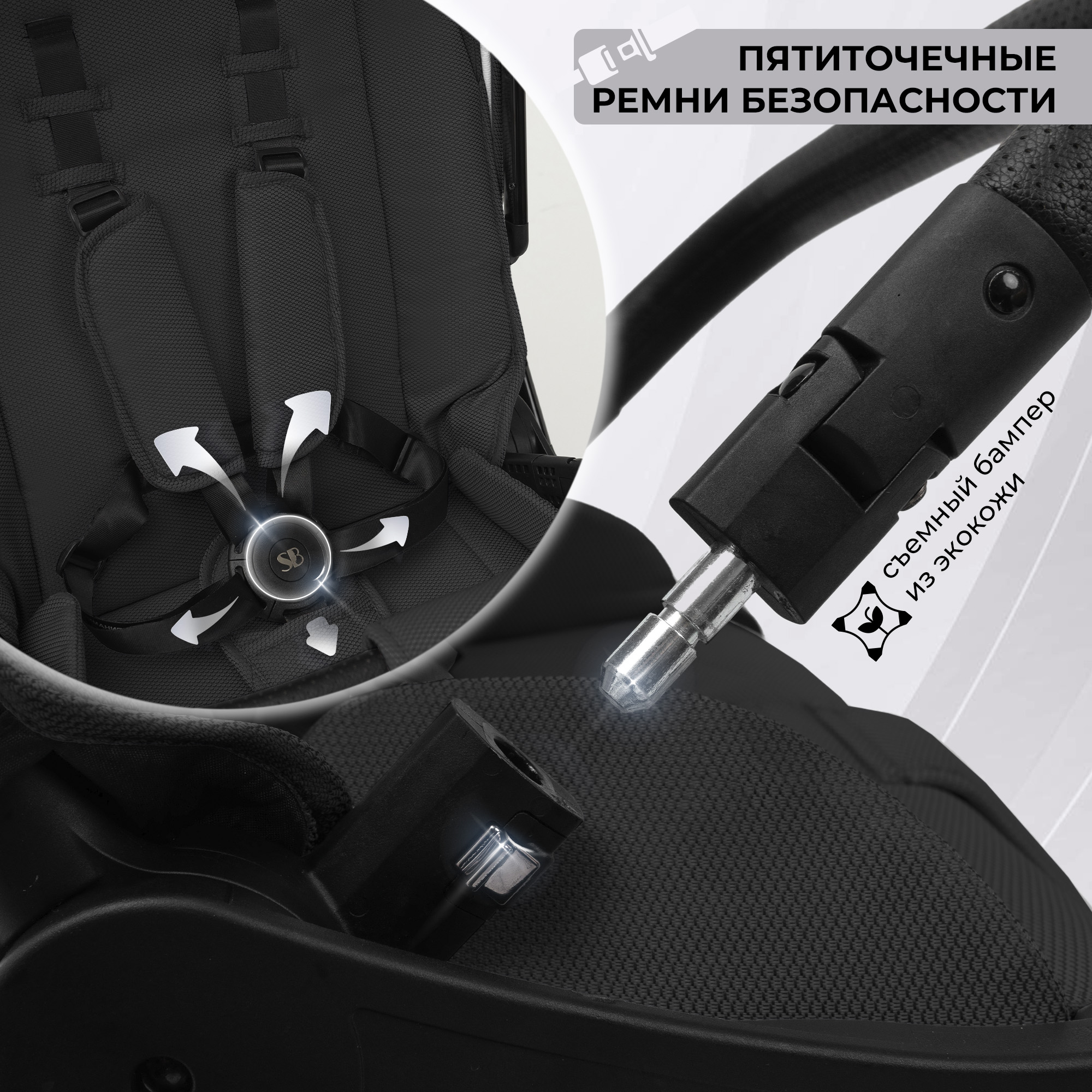 -Съемный поворотный бампер из экокожи с легким доступом к ребенку.