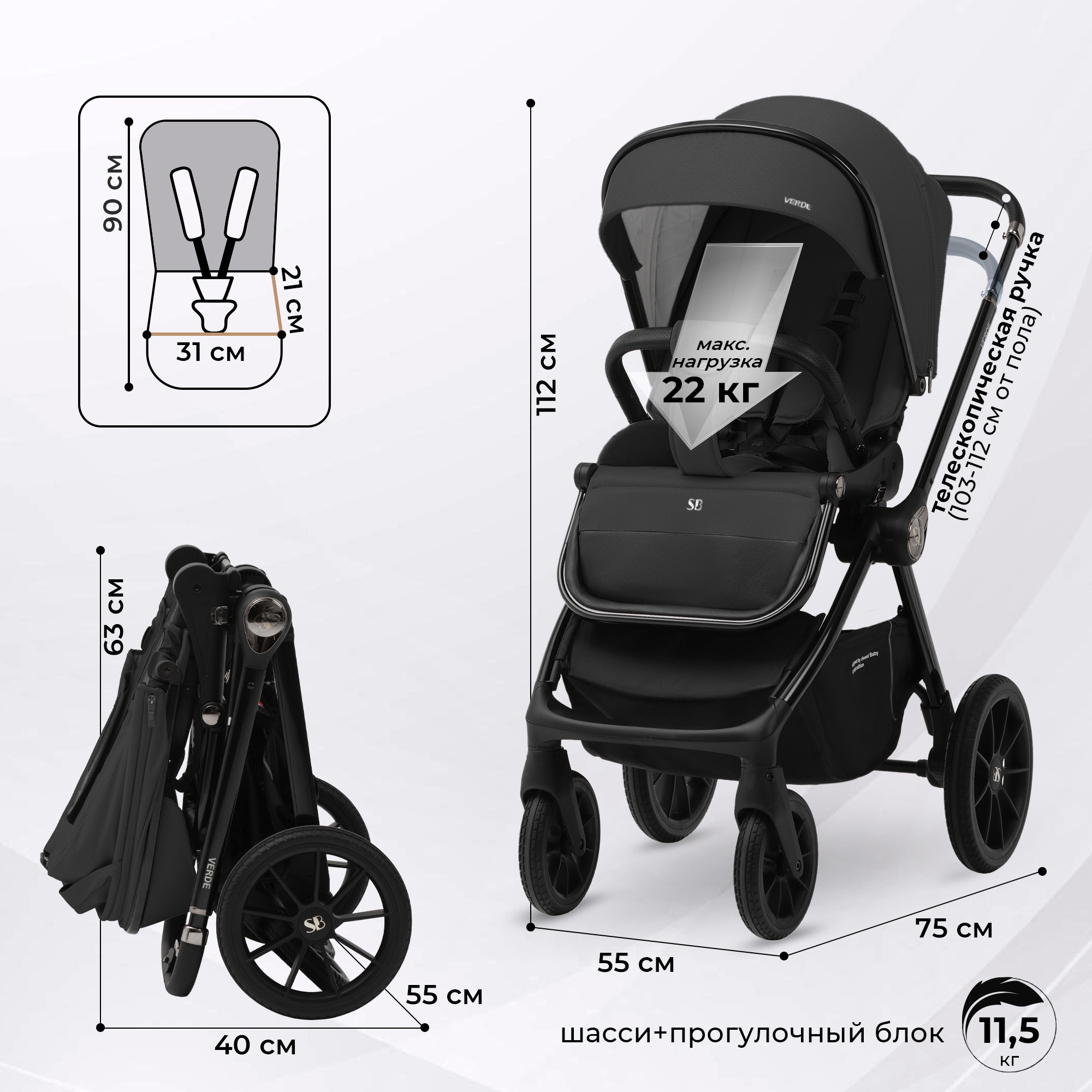 Вес коляски (с прогулочным блоком): 11,5 кг
