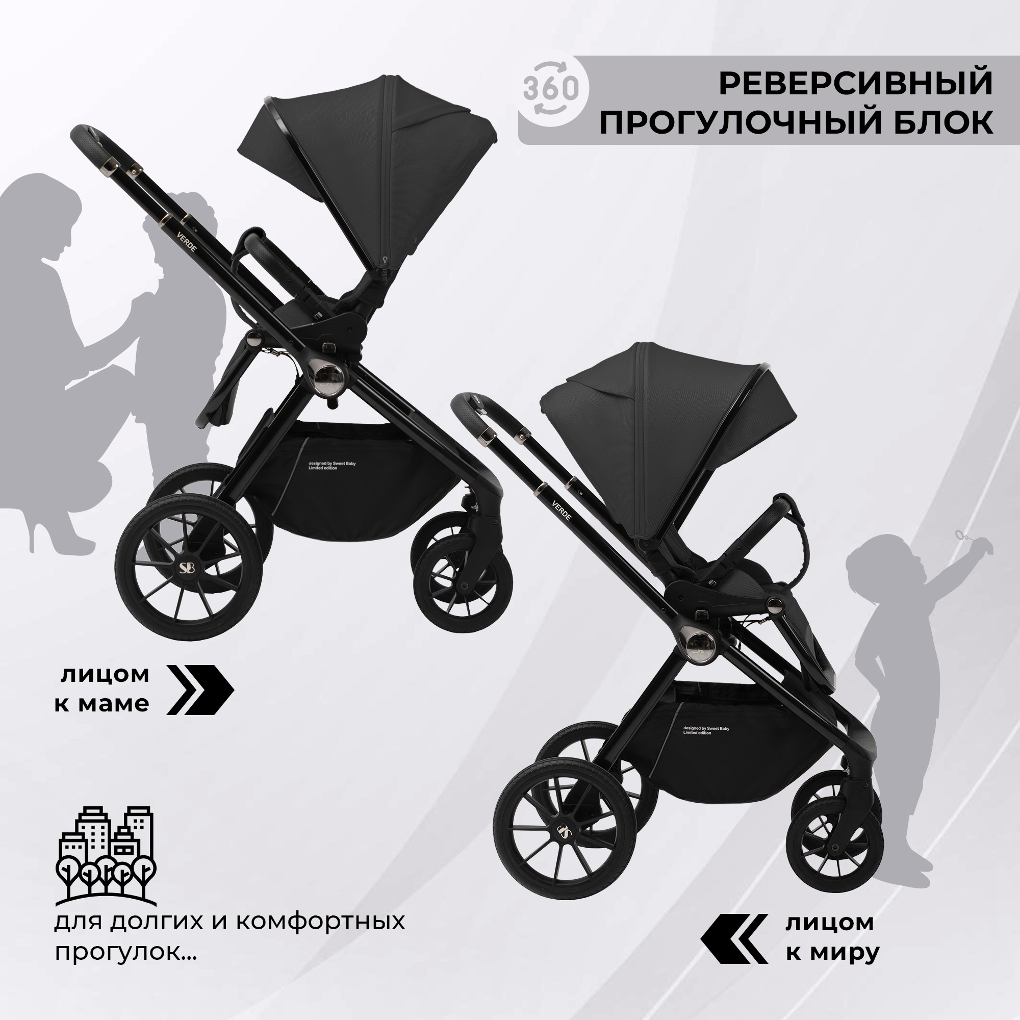 - Реверсивный прогулочный блок: можно установить как лицом к родителю, так и лицом к миру;