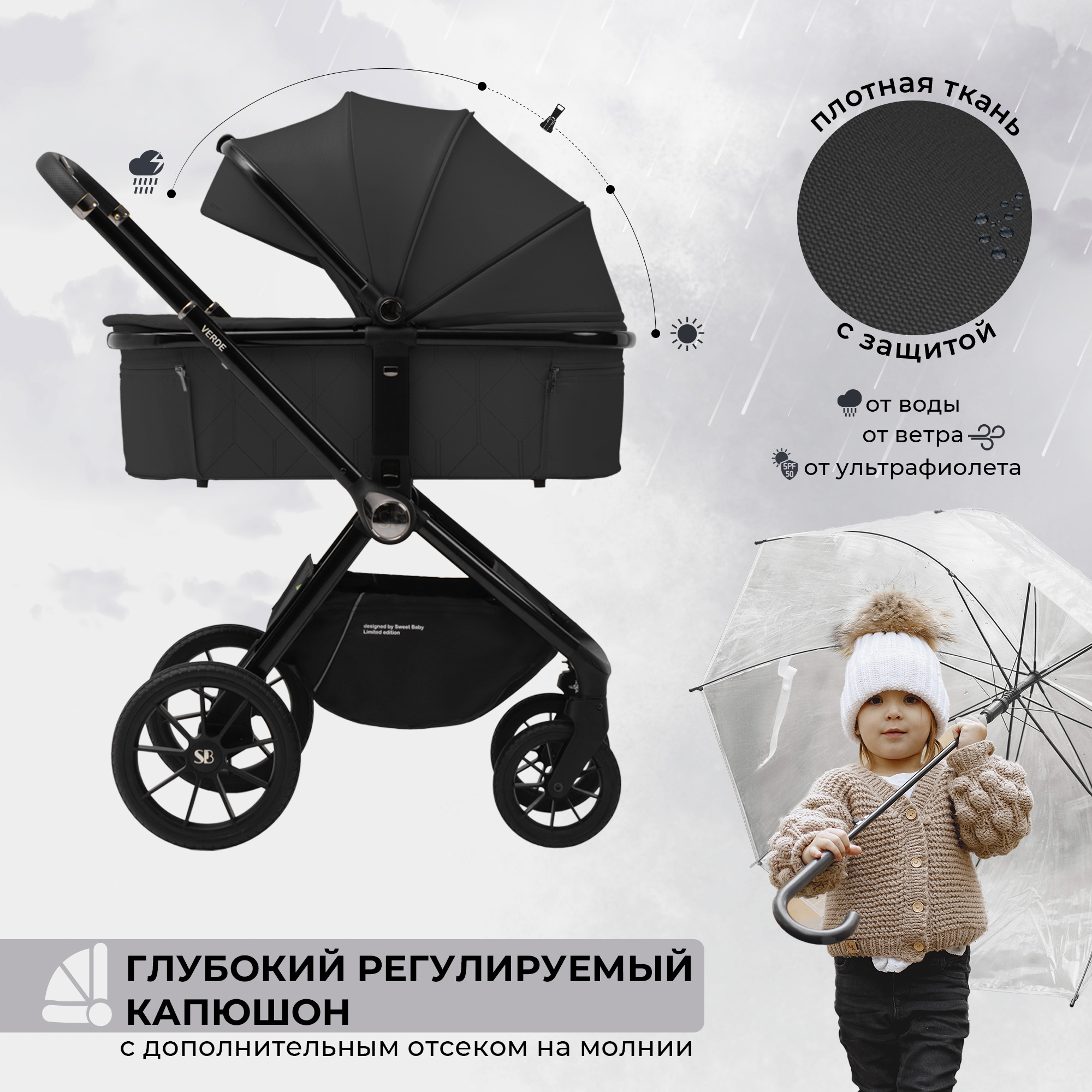 - Большой регулируемый капюшон с дополнительной секцией