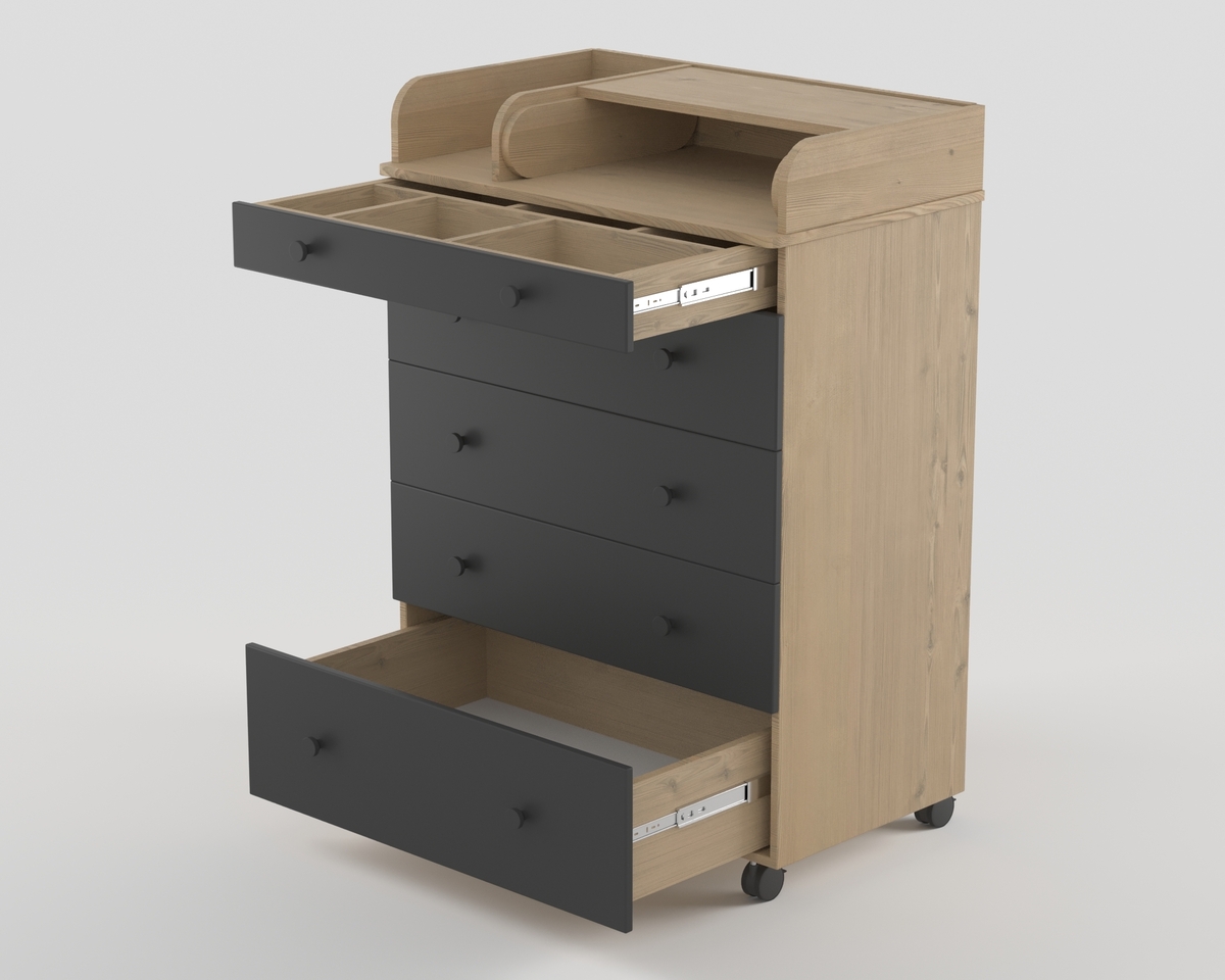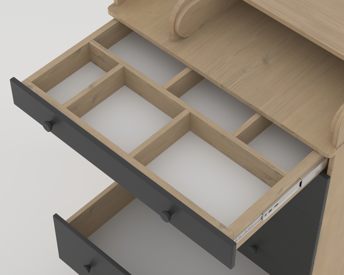 Верхний ящик оснащён органайзером для удобства хранения мелочей и детской косметики.