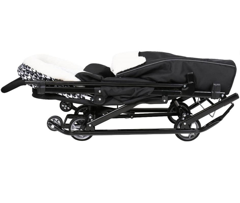 Складной козырек с фиксатором и смотровым окошком защищает малыша от непогоды, а чехол для ног на молнии и утепленная муфта-рукавички сохраняют тепло.